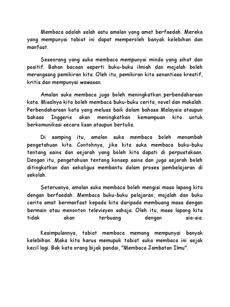 Membaca merupakan satu amalan yang baik dan perlu diamalkan oleh murid-murid kerana banyak kebaikan yang akan diperolehi. Koleksi Contoh Karangan SPM Bahasa Melayu Sijil Pelajaran Malaysia Berikut adalah contoh-contoh karangan mengikut tema yang selalu digunakan sebagai tajuk soalan. Peranan Ibu Bapa dalam memupuk minat membaca dalam anak-anak mereka dan Faedah Faedah Amalan Membaca di Kalangan Masyarakat.